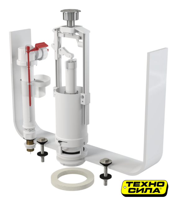 для бачка унитаза, латунь/пластик, нижний подвод воды, двухрежимный, белый/серый
