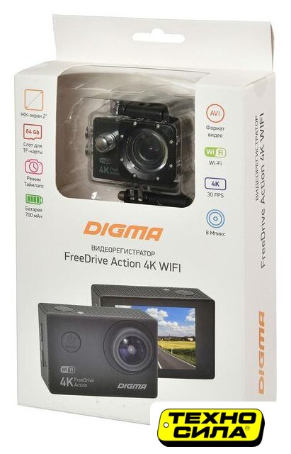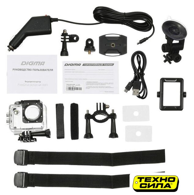 Комплект поставки | - Видеорегистратор FreeDrive Action 4K WIFI- Крепление на лобовое стекло автомобиля- Водонепроницаемый бокс- Крепление на руль велосипеда- Основное крепление- Крепление для шлема- Адаптер-кронштейн 1- Адаптер-кронштейн 2- Повязка-бандаж- Дополнительный скотч 3М- Автомобильный адаптер питания- Батарея- Рамка- USB-кабель- Руководство пользователя- Гарантийный талон |