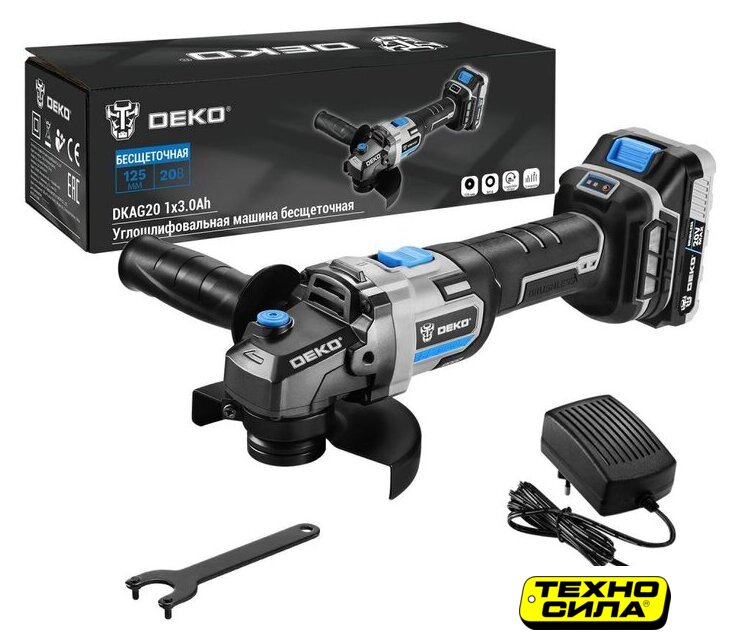 Комплект поставки | - Углошлифовальная машина;- Вспомогательная ручка;- Гаечный ключ;- Аккумулятор 3,0 Ач;- Зарядное устройство;- Инструкция;- Коробка. |
