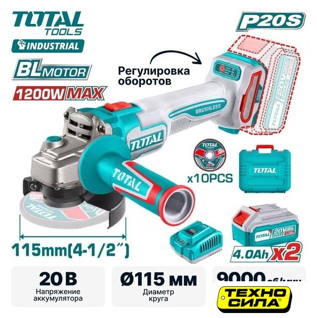 Комплект поставки | - Угловая шлифмашина - 1 шт.- Аккумулятор 4,0 Ач TFBLI20021 - 2 шт.- Зарядное устройство TFCLI20411 - 1 шт.- Боковая рукоятка - 1 шт.- Фланцевый ключ - 1 шт.- Отрезные диски по металлу - 10 шт.- Инструкция- Кейс |