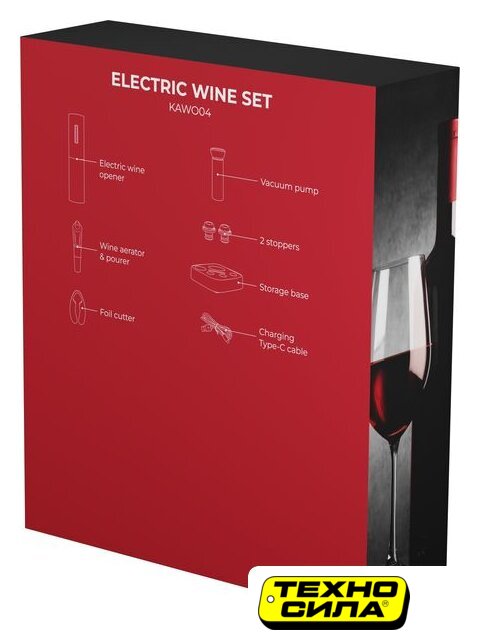Состав набора | электроштопор, аэратор, вакуумный насос, нож для горлышка бутылки, пробка для бутылки |