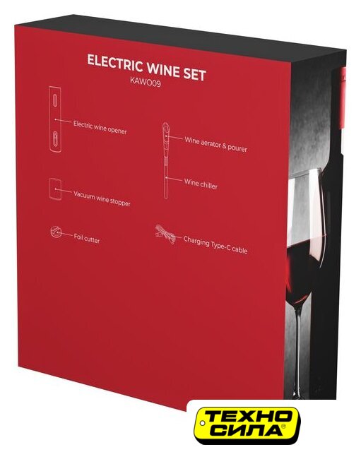 Состав набора | электроштопор, аэратор, вакуумная пробка, нож для горлышка бутылки, охладитель |