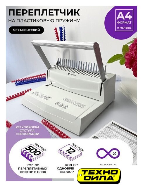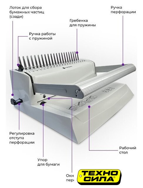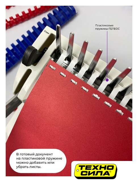 пружинный механический, пластиковая пружина, толщина переплета: 500 листов, одновременная перфорация 14 листов, шаг перфорации: 9:16