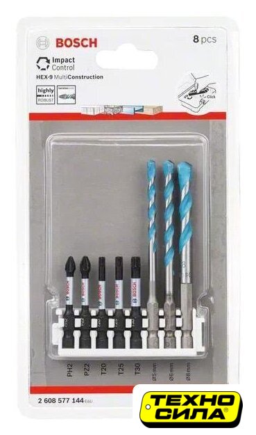 | Комплектация | - Сверла Hex-9 MultiConstruction 5, 6, 8 мм;- Биты Impact Power 50 мм PH2, PZ2, T20, T25, T30. |