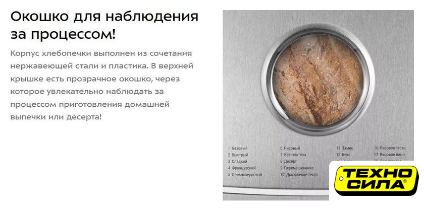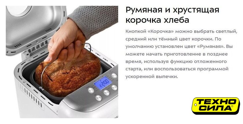 550 Вт, вес выпечки: 500 г, 12 программ выпечки, выбор цвета корочки, замес теста