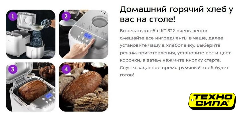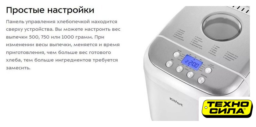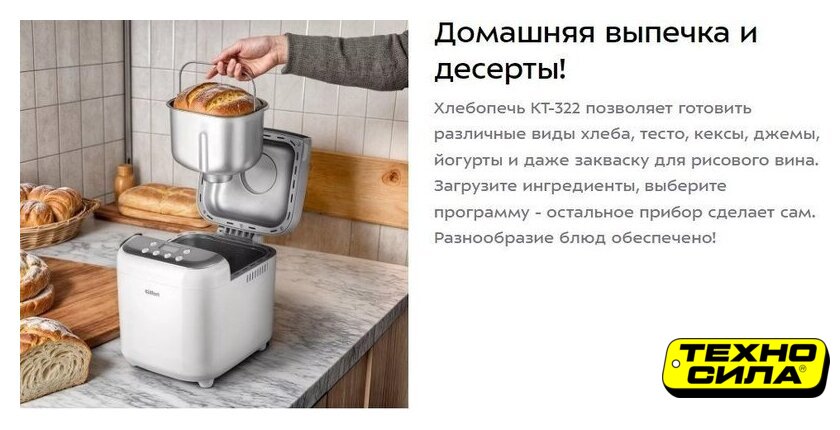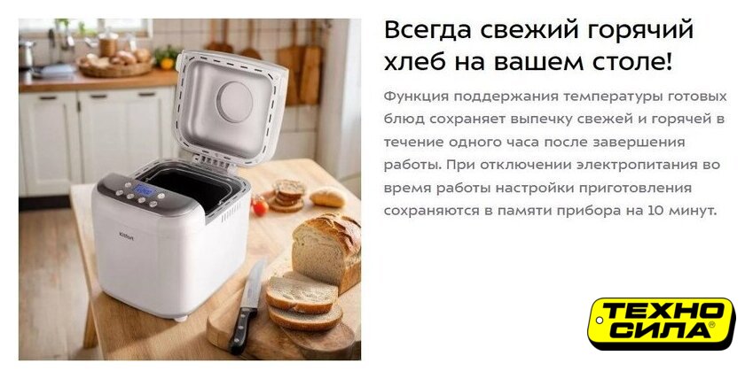 550 Вт, вес выпечки: 750 г, 12 программ выпечки, замес теста