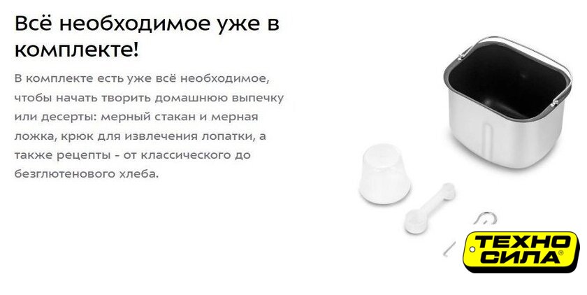 Комплектация | мерная ложка, мерный стакан, лопасть для замешивания теста, крюк для извлечения лопасти |