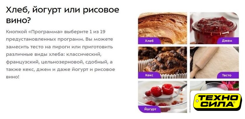 Перечень режимов работы | кекс, сладкая выпечка, безглютеновая выпечка, йогурт, французский хлеб, быстрая выпечка, десерт, рисовый хлеб, цельнозерновой хлеб, дрожжевое тесто, рисовое вино, выпечка, замес теста, разморозка, джем, запекание |