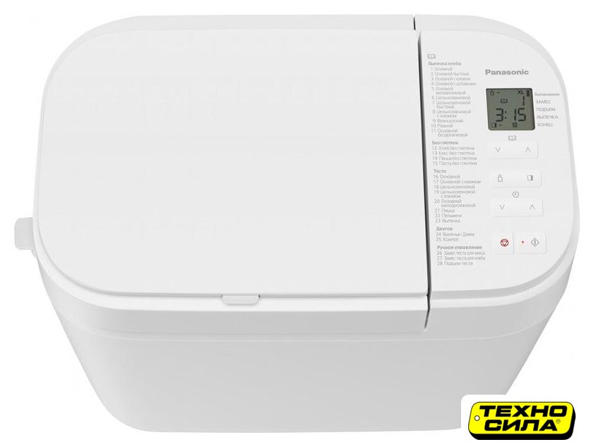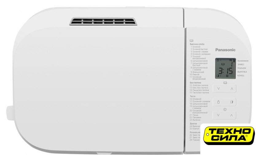 Перечень режимов работы | Авто меню (Хлеб):1. Основной2. Основной быстрый3. Основной с изюмом4. Основной с добавками5. Основной малодрожжевой6. Цельнозерновой7. Цельнозерновой быстрый8. Цельнозерновой с изюмом9. Французский10. Ржаной11. Основной бездрожжевойАвто меню (Без глютена):12. Хлеб без глютена13. Кекс без глютена14. Пицца без глютена15. Паста без глютенаАвто меню (Тесто):16. Основной17. Основной с изюмом18. Цельнозерновой19. Цельнозерновой с изюмом20. Основной малодрожжевой21. Пицца22. ПельмениАвто меню (Другое):23. Выпечка24. Варенье/Джем25. Фрукты в сиропеАвто меню (Ручное управление):26. Замес теста для кекса27. Замес теста для хлеба28. Подъем теста |