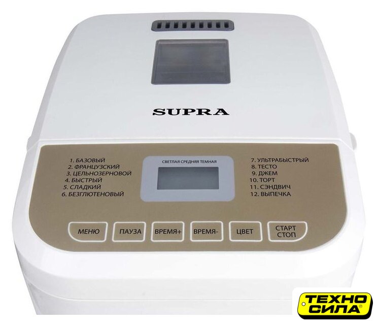 Перечень режимов работы | 1. Базовый2. Французский3. Цельнозерновой4. Быстрый5. Сладкий6. Безглютеновый7. Ультрабыстрый8. Тесто9. Джем10. Торт11. Сэндвич12. Выпечка |