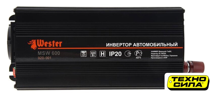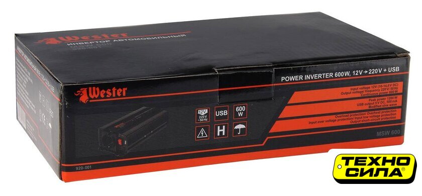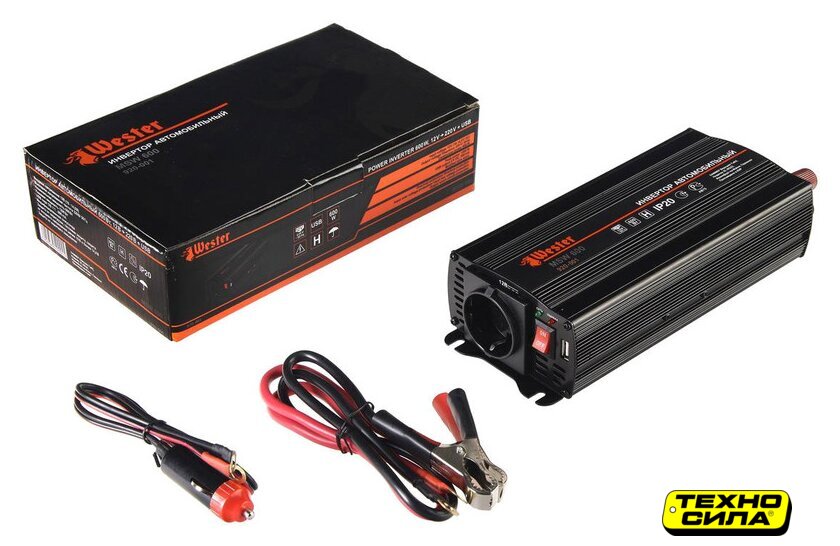 вход: 11–15 В, выход: 230 В, КПД: 85%, защита от короткого замыкания, от перегрузки, от перегрева