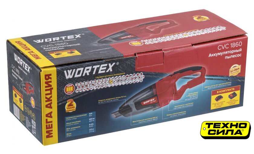 Комплект поставки | - Пылесос (1 шт.);- Аккумулятор WORTEX CBL 1820-1, 2 А*ч (1 шт.);- Зарядное устройство WORTEX FC 1515-1 (1 шт.);- Всасывающая трубка (1 шт.);- Насадка щелевая (1 шт.);- Насадка щетинная (1 шт.);- Насадка для всасывания жидкости (1 шт.);- Насадка прямоугольная (1 шт.);- Фильтр тонкой очистки HEPA (1 шт.);- Инструкция по эксплуатации (1 шт.); |