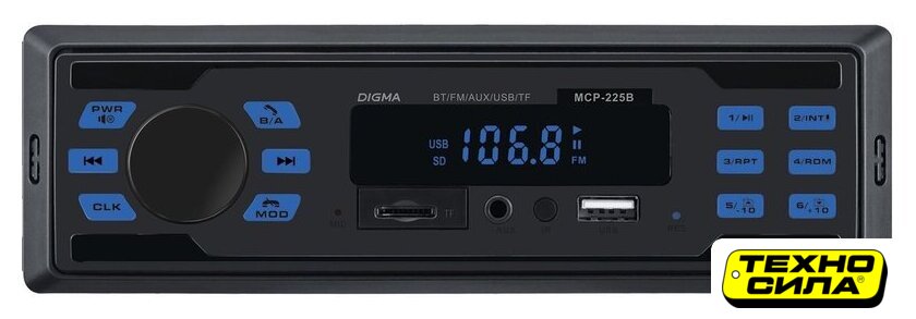 1DIN, USB-проигрыватель, USB, карты памяти, Bluetooth, усилитель 4x45 Вт, экран монохромный