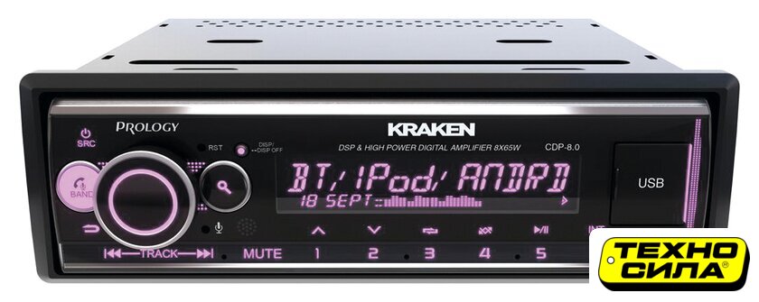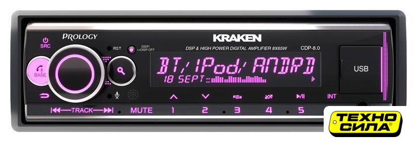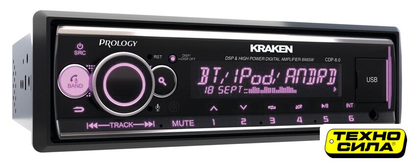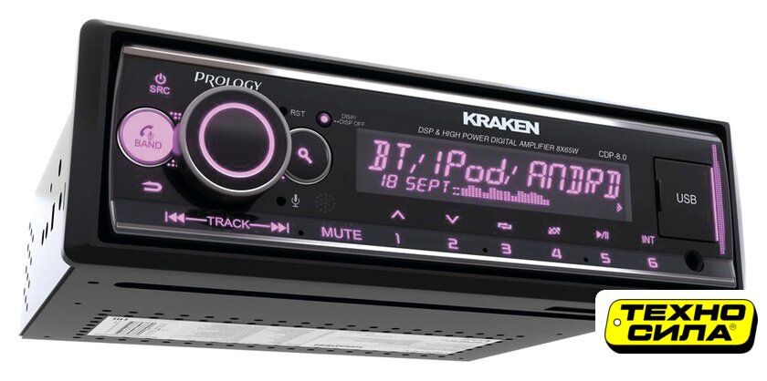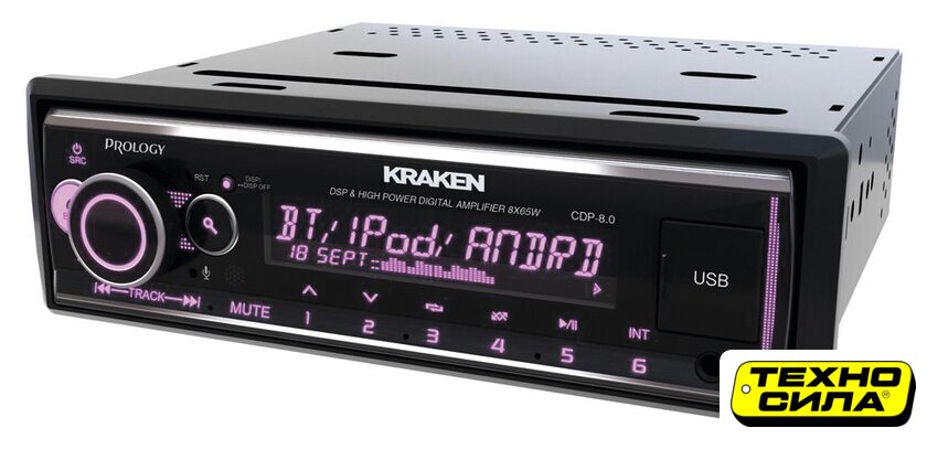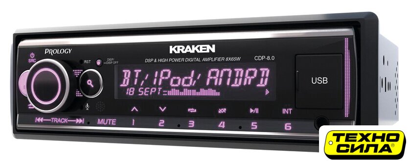 1DIN, USB-проигрыватель, USB, Bluetooth, усилитель 8x65 Вт, экран монохромный, пульт