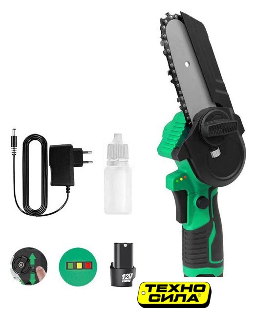 аккумуляторная, бытовая, 12 В, шаг цепи: 1/4 дюйма, длина шины: 10 см, аккумулятор в комплекте, быстрое натяжение цепи, 1.2 кг