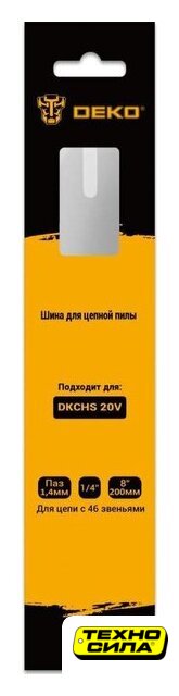металл, шаг цепи 1/4", 46 звеньев, длина шины 20 см (8"), совместимость: Deko DKCHS 20V