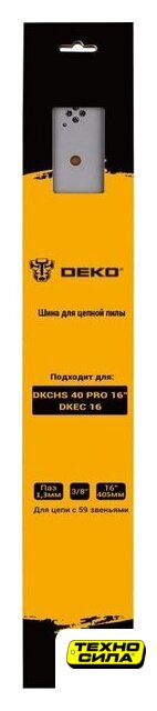 металл, шаг цепи 3/8", 59 звеньев, длина шины 40.5 см (16"), совместимость: Deko DKEC16/Deko DKCHS 40 PRO 16"