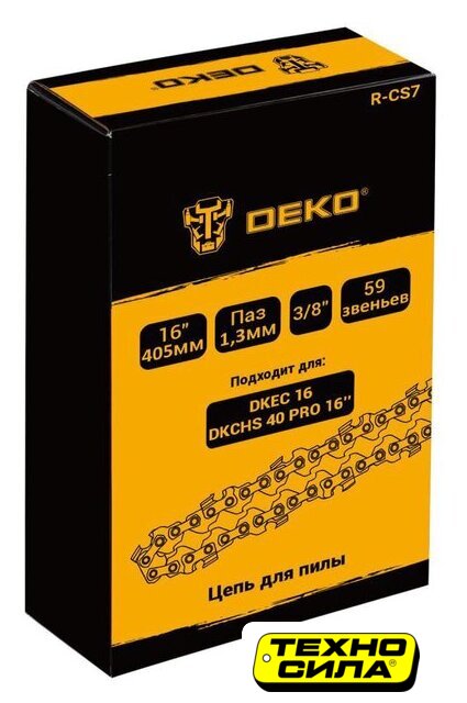 металл, шаг цепи 3/8", 59 звеньев, длина шины 40.5 см (16"), совместимость: Deko DKEC16/Deko DKCHS 40 PRO 16"