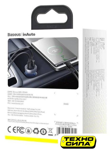 автомобильное зарядное для телефонов/для планшетов, USB Type-C, 60 Вт, быстрая зарядка, кабель USB Type-C/кабель Lightning, 0.7 м