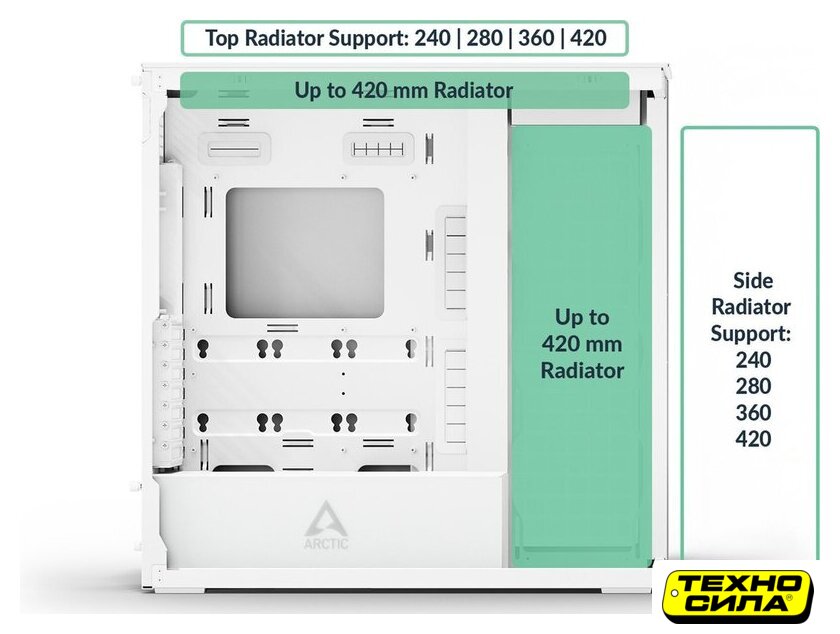 Расположение вентиляторов | сверху:3x120 мм или 3x140 ммсбоку:3x120 мм или 3x140 ммсзади:2x120 ммустановленысбоку:3x140 ммсзади:2x120 мм |