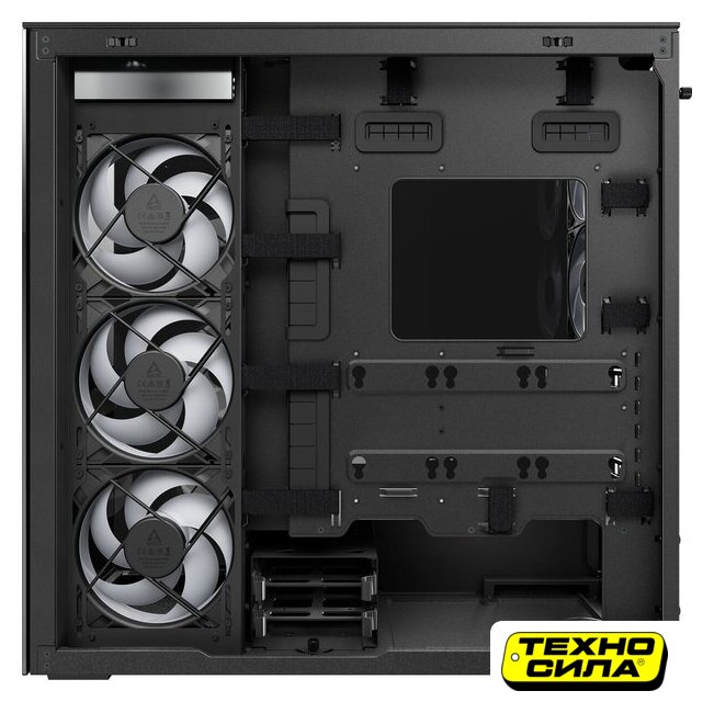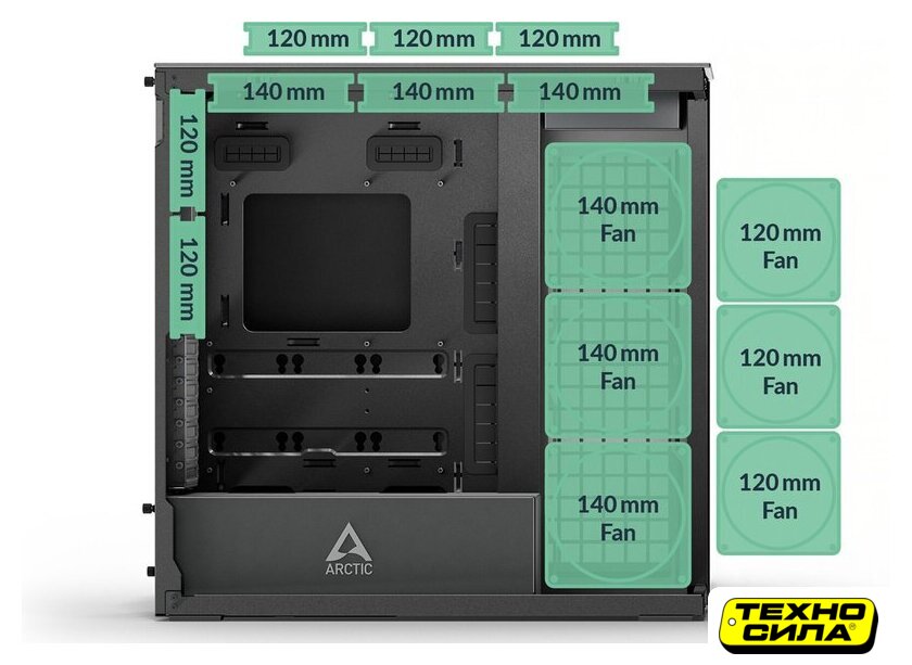 Расположение вентиляторов | сверху:3x120 мм или 3x140 ммсбоку:3x120 мм или 3x140 ммсзади:2x120 ммустановленысбоку:3x140 ммсзади:2x120 мм |