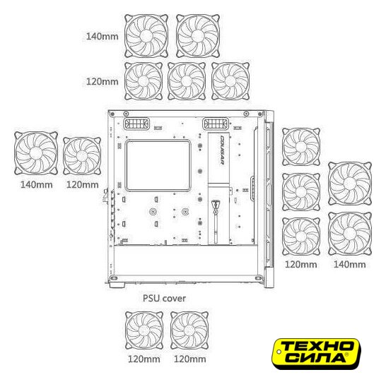 Конфигурация вентиляторов | спереди: 120mm x 3 / 140mm x 2сверху: 120mm x 3 / 140mm x 2снизу на кожухе БП: 120mm x 2сзади: 120mm x 1 / 140mm x 1в комплекте:спереди: 120mm ARGB fan x 3сзади: 120mm ARGB fan x 1 |