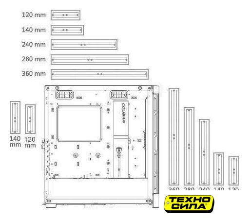 Расположение СЖО | спереди: 360mm / 280mm / 240 mm / 140 mm / 120mmсверху: 360mm / 280mm / 240 mm / 140 mm / 120mmсзади: 140 mm / 120mm |
