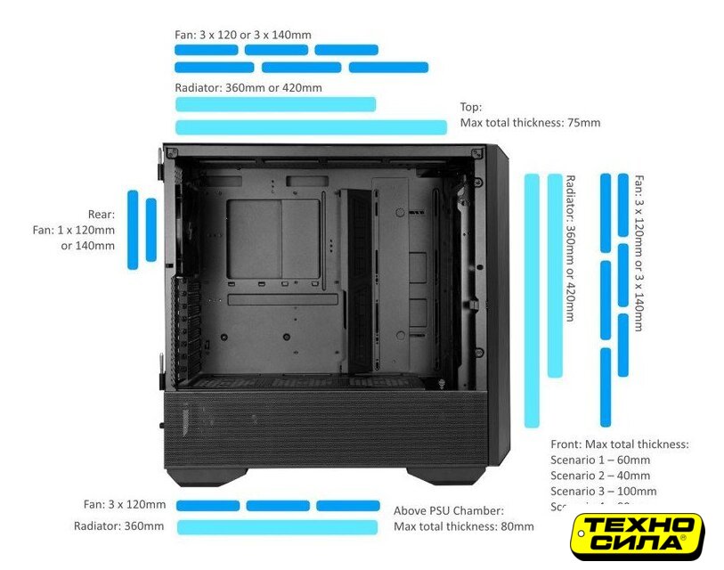 | Расположение СЖО | Спереди: 360 мм или 420 ммВерх: 360 мм или 420 ммНад камерой блока питания: 360 мм |