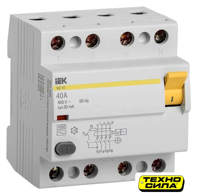 40 А, 4P, ном. отключающая способность 4.5 кА, тип дифф. тока AC, ток утечки 100 мА