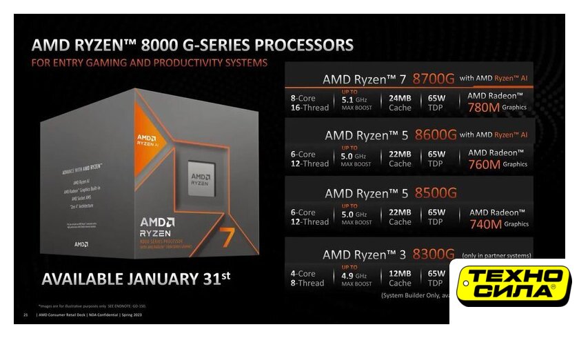 2024 г, Phoenix, AM5, 8 ядер, 16 потоков, частота 5.1/4.2 ГГц, кэш 8 МБ + 16 МБ, техпроцесс 4 нм, TDP 65W
