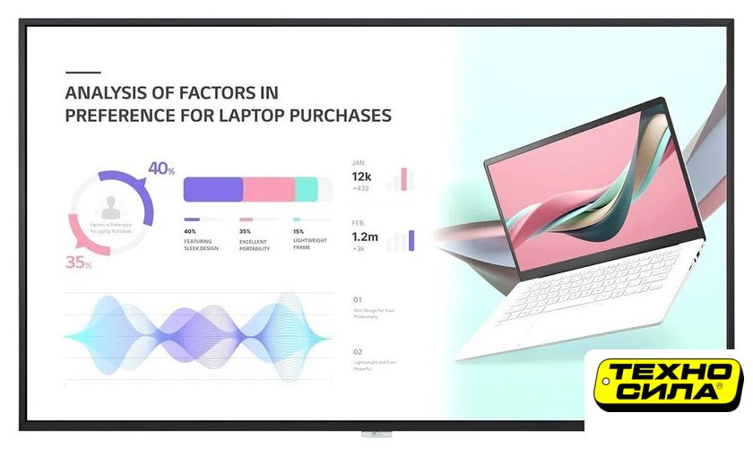 55" 3840x2160, сенсорный, матрица IPS, яркость 400 кд/м2, контраст 1200:1, BT, Wi-Fi,USB
