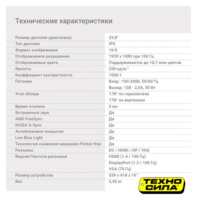 23.8", 16:9, 1920x1080, IPS, 100 Гц, интерфейсы HDMI+D-Sub (VGA)