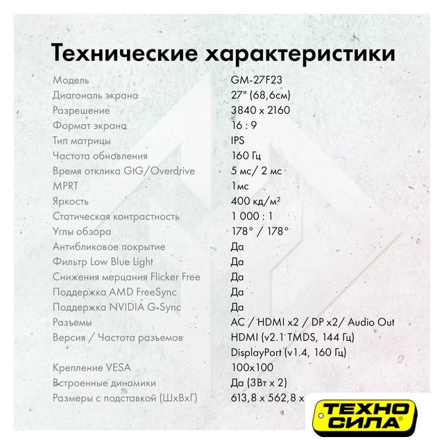 27", 16:9, 2560x1440, IPS, 260 Гц, AMD FreeSync Premium/совместимый с NVIDIA G-Sync, динамики, интерфейсы HDMI+DisplayPort