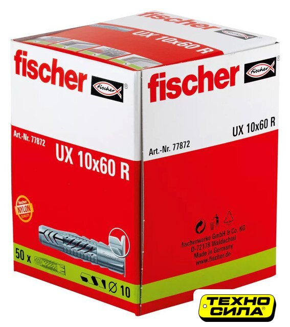50 в упаковке, 60 x 10 мм, нейлон, применение: бетон/газобетон/гипсокартон/дерево/керамзитовые блоки/металл/пенобетон/пенополистирольные плиты DPP/полнотелый кирпич/природный камень/пустотелая плита/пустотелый кирпич/силикатный кирпич