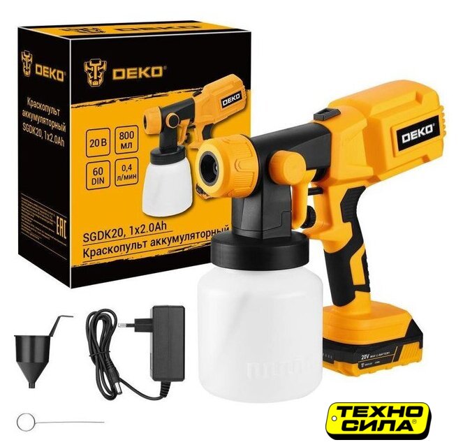 Комплект поставки | - Краскопульт – 1 шт.- Аккумулятор 2,0 Ач – 1 шт.- Зарядное устройство – 1 шт.- Стакан для измерения вязкости – 1 шт.- Игла для прочистки сопла – 1 шт.- Руководство по эксплуатации- Коробка |