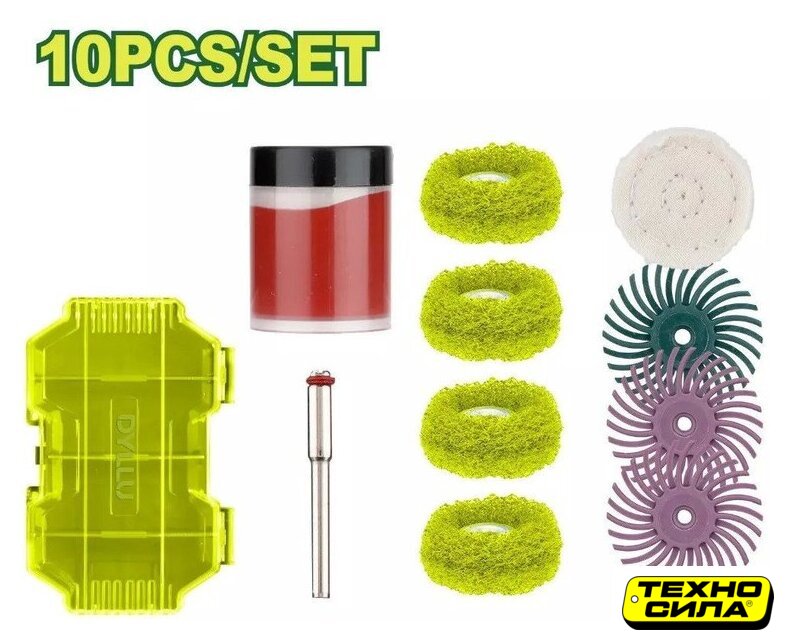 Комплектация | - Полировальная паста - 1 шт.- Абразивный диск - 4 шт.- Полировальный диск - 1 шт.- Абразивные щетки - 3 шт.- Хвостовик 1/8'' - 1 шт.- Кейс |