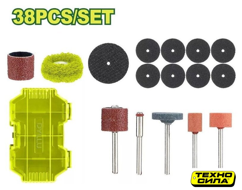 Комплектация | - Отрезной круг - 1 шт.- Абразивный полировальный круг - 1 шт.- Шлифовальная лента - 6 шт.- Шлифовальный камень - 3 шт.- Шлифовальный диск - 25 шт.- Шлифовальный барабан с оправкой - 1 шт.- Хвостовик 1/8'' - 1 шт.- Кейс |