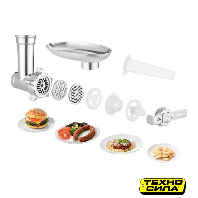 Полная комплектация | Чаша 6лБлендер 1,5лВенчикНасадка для тестаНасадка для смешиванияГибкая насадка для смешиванияМясорубка со сменными дисками для регулировки степени измельчения, насадка для колбас, насадка для формовки печеньяОвощерезка со сменными терками (мелкая терка, средняя терка, крупная терка, ломтерезка)Крышка |