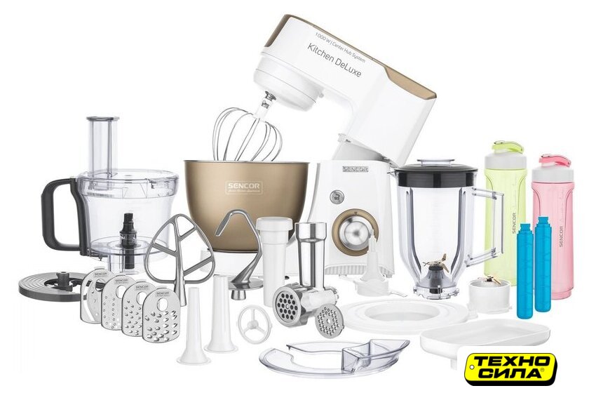 Полная комплектация | крюк для замеса, взбивающий венчик в форме буквы А, сферический венчик для взбивания. Насадка для заполнения копченостей с 2 диаметрами. 2 бутылки из материала Тритан с 2 охлаждающими элементами (ICE STICK). Настольный миксер с титановыми лезвиями объёмом 1,25 л. Многофункциональный кухонный комбайн объемом 1,25 л, с 4 насадками и измельчителем. Мясорубка для грубого и мелкого помола с насадкой для заполнения копченостей с 2 диаметрами. Чаша для замеса объёмом 4,5 литра из нержавеющей стали и измерительной шкалой |