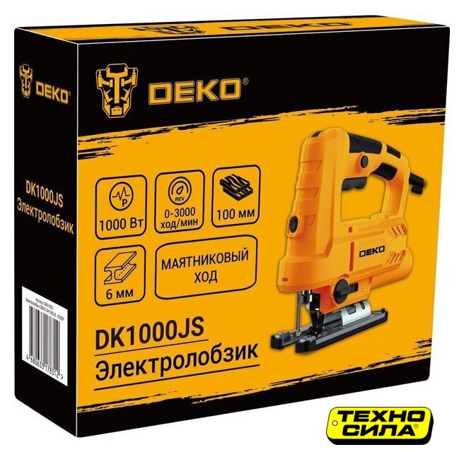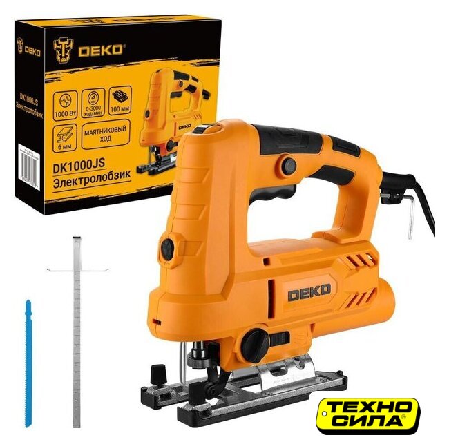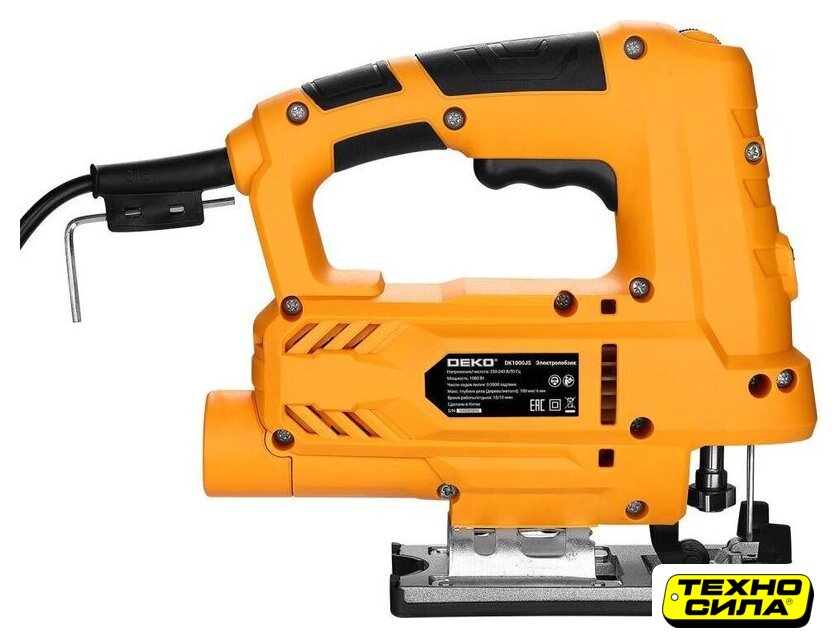 рукоятка-скоба, питание: сеть, 900 Вт, глубина пропила: 100 мм (дерево), 6 мм (сталь), 800–3000 ходов/мин, 2.5 кг