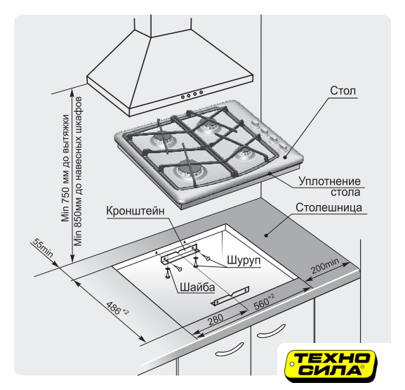 газовая на 3 конфорки, закаленное стекло, мощность: 5750 Вт, автоматический электроподжиг, решетки: чугун, независимая установка, размеры (ШхГ): 44x52 см