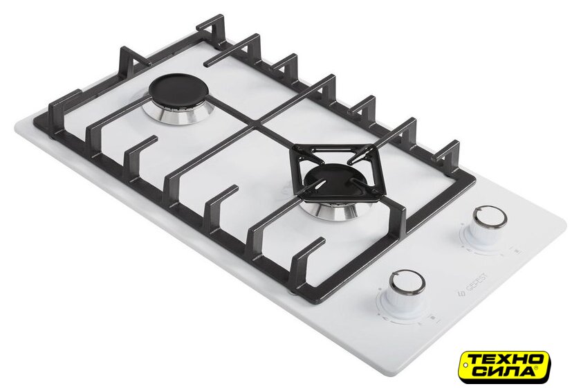 газовая на 2 конфорки, закаленное стекло, мощность: 4000 Вт, автоматический электроподжиг, газ-контроль, решетки: эмалированная сталь, независимая установка, размеры (ШхГ): 30x51 см