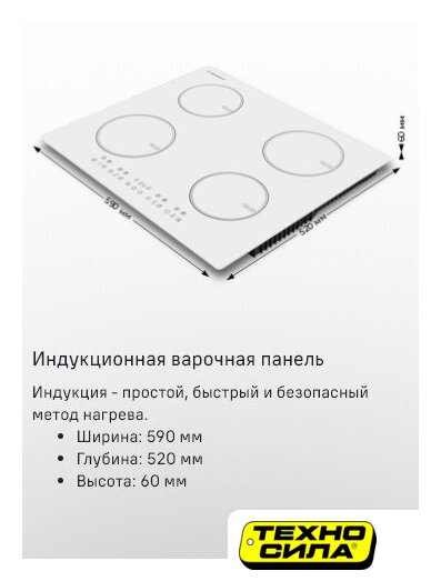 индукционная на 4 конфорки, cтеклокерамика, независимая установка, размеры (ШхГ): 59x52 см