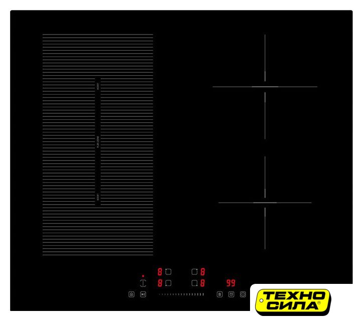 Подробная информация о конфорках | левая передняя конфорка 180мм, 1800Вт/бустер 2200Вт --- левая задняя конфорка 180мм, 1300Вт/бустер 1500 Вт --- правая задняя конфорка 180мм, 1800Вт/бустер 2200 Вт --- правая передняя конфорка 180 мм, 1300Вт/бустер 1500Вт --- флекси зона 180*380мм 3000Вт/ бустер 3600 Вт |