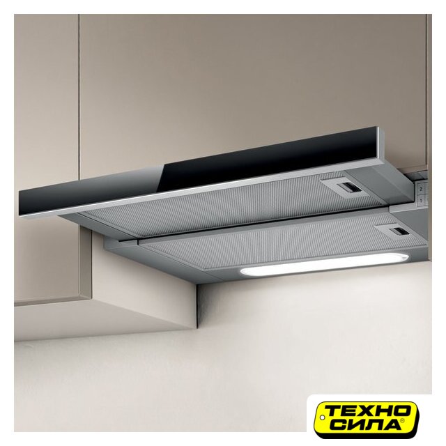 конструкция купольная, монтаж настенный, ширина 49.6 см, управление механическое/кнопочное, производительность мотора 430 м³/ч, цвет черный