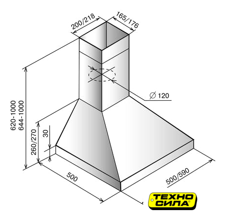 конструкция купольная, монтаж настенный, ширина 50 см, управление механическое/кнопочное, производительность вытяжки 450 м³/ч, производительность мотора 900 м³/ч, цвет черный