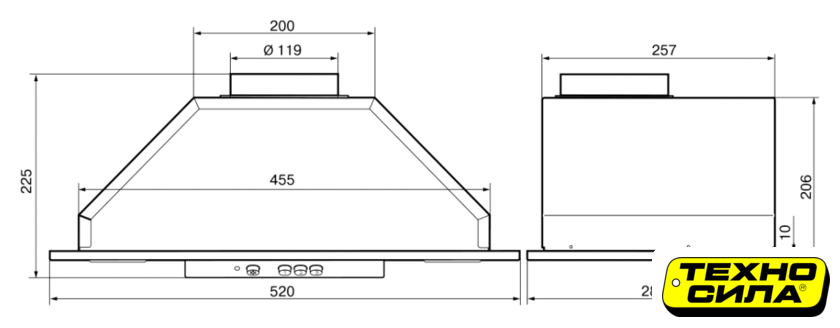 конструкция телескопическая, монтаж для встраивания, управление механическое/кнопочное, производительность мотора 400 м³/ч, ширина 50 см