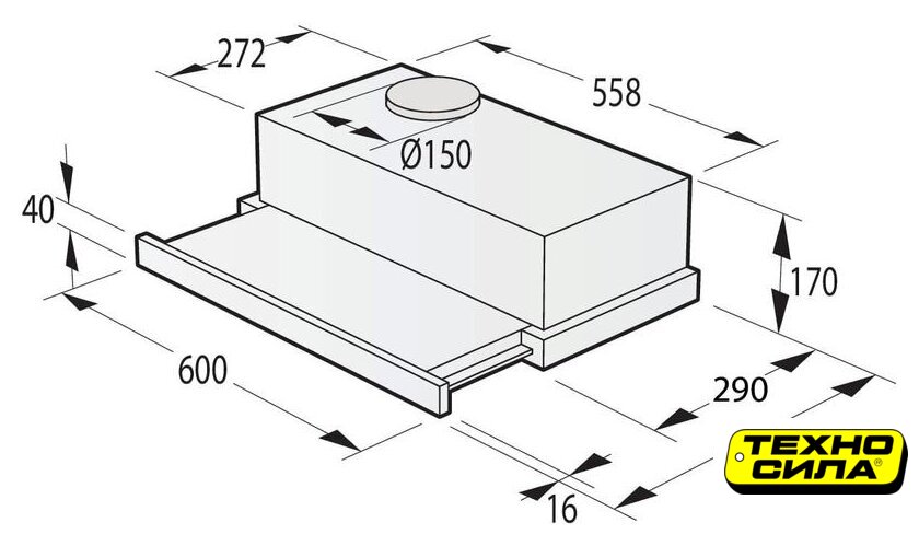 конструкция купольная, монтаж настенный, управление механическое/слайдерное, производительность мотора 650 м³/ч, ширина 59 см