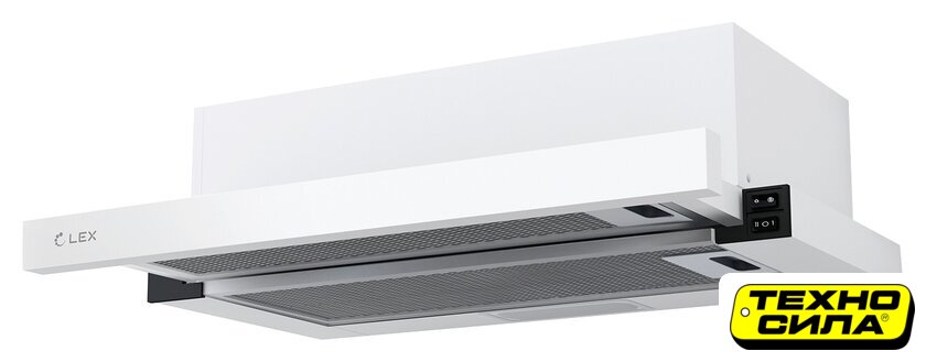 конструкция телескопическая, монтаж для встраивания, ширина 50 см, управление механическое/кнопочное, производительность мотора 690 м³/ч, цвет белый