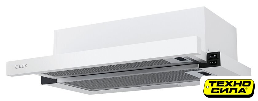 конструкция телескопическая, монтаж для встраивания, управление механическое/кнопочное, производительность мотора 400 м³/ч, ширина 60 см